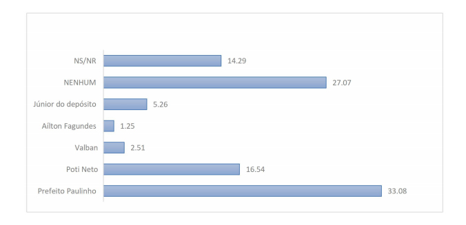 O ex-candidato a prefeito Poti Neto aparece em segundo com 16,54%. Em seguida aparecem: Júnior do Depósito (5,26%), Edson Valban (2,51%) e Ailton Fagundes (1,25%). O total dos que não souberam responder foi de 14,29% e o dos que afirmaram não votar em qualquer dos nomes foi de 27,07%.